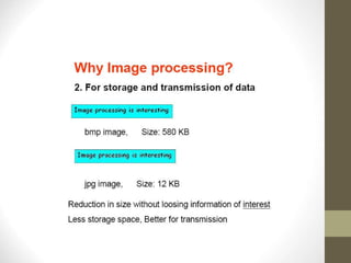 - It discusses the history of digital image processing from the 1920s to today, highlighting early applications and key advances like CAT scans.