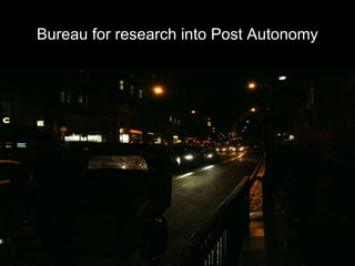 The document repeatedly discusses a "Bureau for research into Post Autonomy" but provides no other details in the text. It appears to be about an organization focused on researching post autonomy, but offers no additional context or information.
