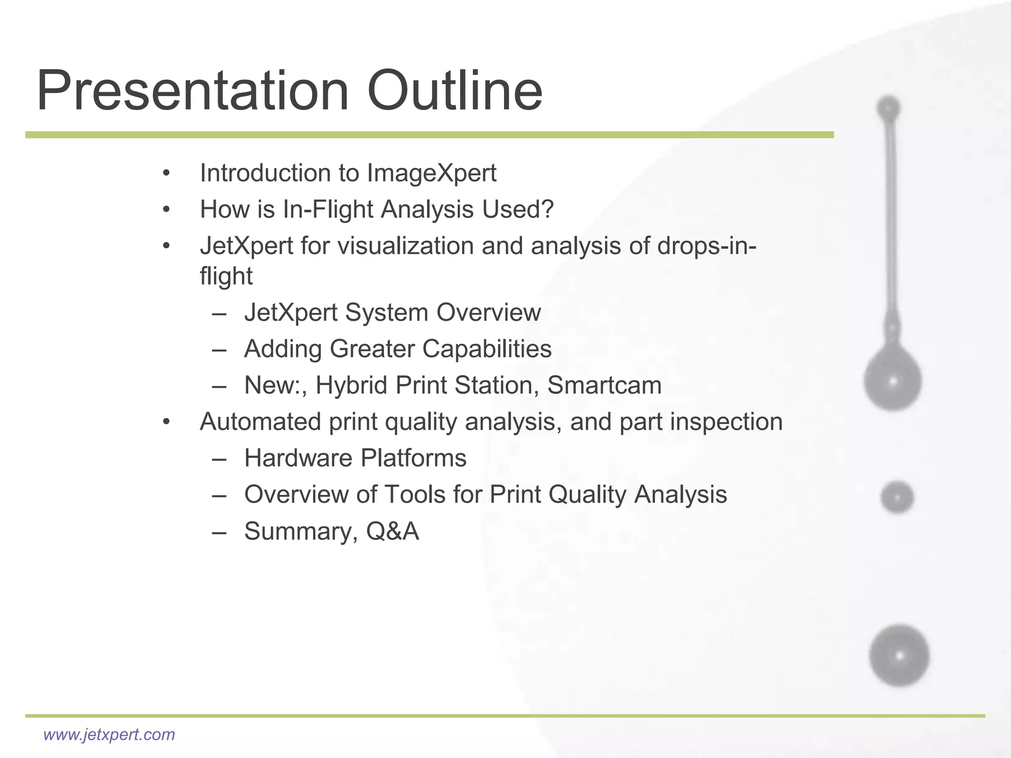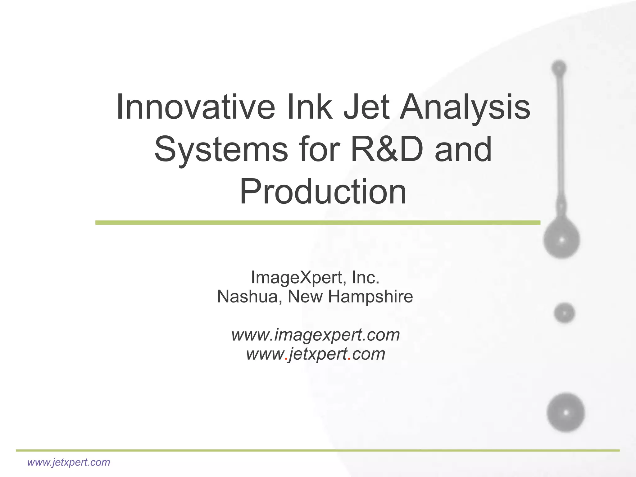 ImageXpert provides innovative ink jet analysis systems for research and development and production. Their JetXpert system allows for visualization and analysis of ink drops in flight through high-speed cameras and software. This provides insights into drop formation, sustainability, misting, and consistency that help optimize ink formulations and print parameters. JetXpert systems have helped many ink manufacturers successfully develop new inks. ImageXpert is continuously enhancing JetXpert's capabilities such as through automated motion and frequency sweep testing.