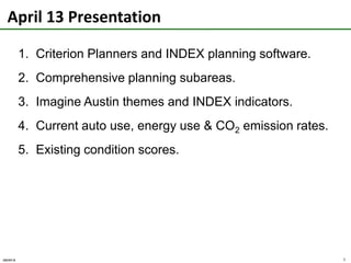 The document provides information from a presentation given to the Austin Citizen Advisory Task Force on April 13, 2010. It discusses Criterion Planners, the planning firm that developed the INDEX planning support software. INDEX allows communities to assess existing conditions, design future scenarios, measure scenarios with performance indicators, and rank/monitor plans. Maps and data from INDEX show existing condition scores for Austin across various indicators related to land use, housing, employment, transportation, energy use, and emissions. Specific metrics examined include density, mix of land uses, proximity to amenities, balance of jobs and housing, transportation patterns, and environmental impacts.