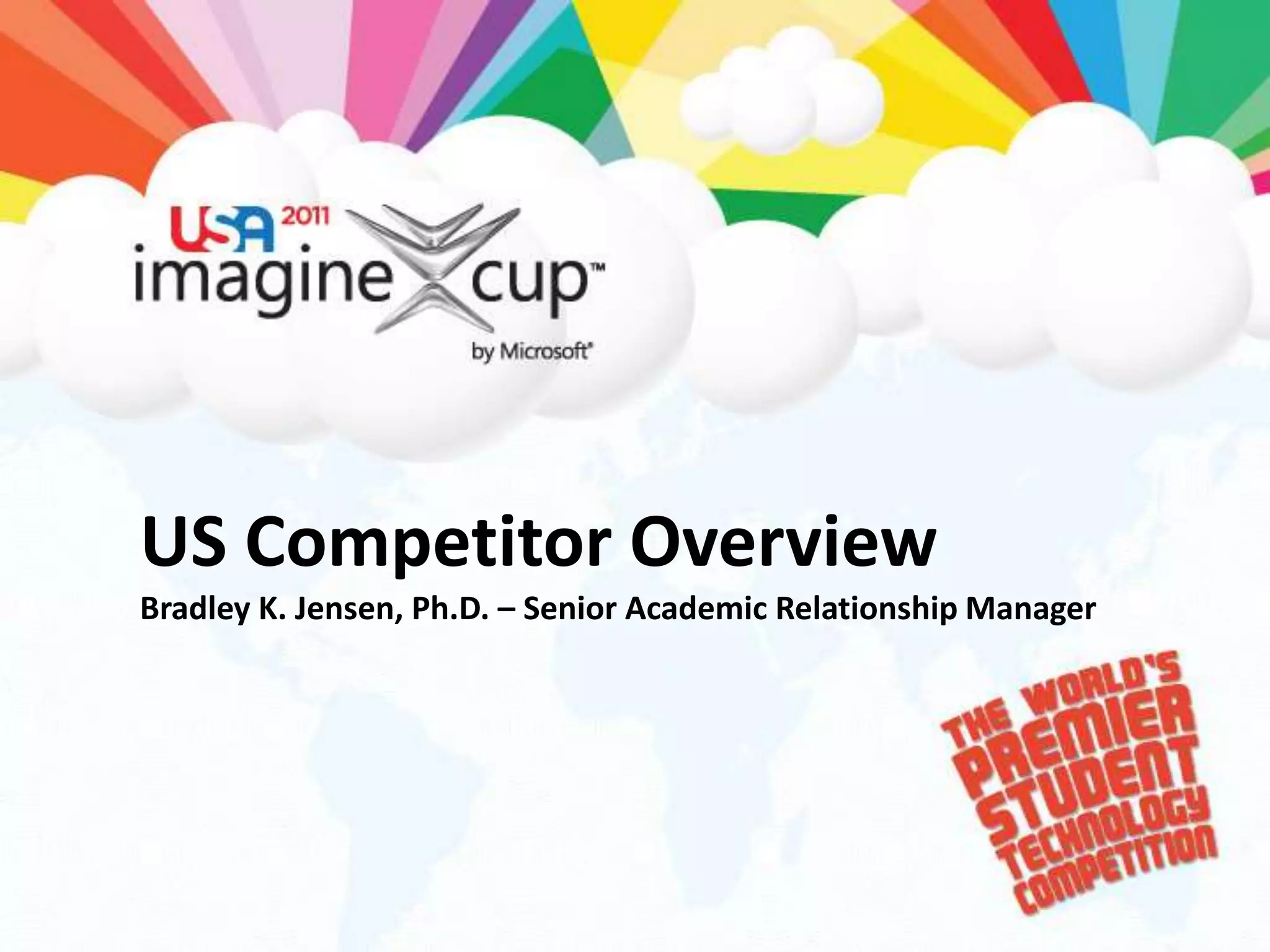 The document provides an overview of the Imagine Cup, an international computer technology competition for students. It discusses that the competition has five categories and six special awards, and teams can have 1-4 students plus a mentor and sponsor. Competing provides experience like working with a live client, getting feedback, and a resume boost. Finalists get career and networking opportunities. The commitment includes developing a software/hardware invention, creating a presentation video, and potentially traveling for finals. Mentors provide guidance while sponsors offer resources but cannot claim ownership of projects. The document lists example projects from past finalists and best practices like having multi-disciplinary teams and getting early feedback.