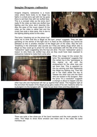 The video depicts illegal toy fighting in a shed, where toys are forced to battle. A girl frees the toys with her stuffed bear. The lyrics do not match the video's concept of toy fighting. The video is fast-paced while the music is slow. The lyrics suggest the toy fighting is illegal and the toys may be under the influence of drugs. The term "radioactive" implies the toys were exposed to radiation, allowing them to come alive. A toy dubbed "the apocalypse" defeats the champion toy and destroys the illegal fighting ring, freeing the other toys with the help of the girl.
