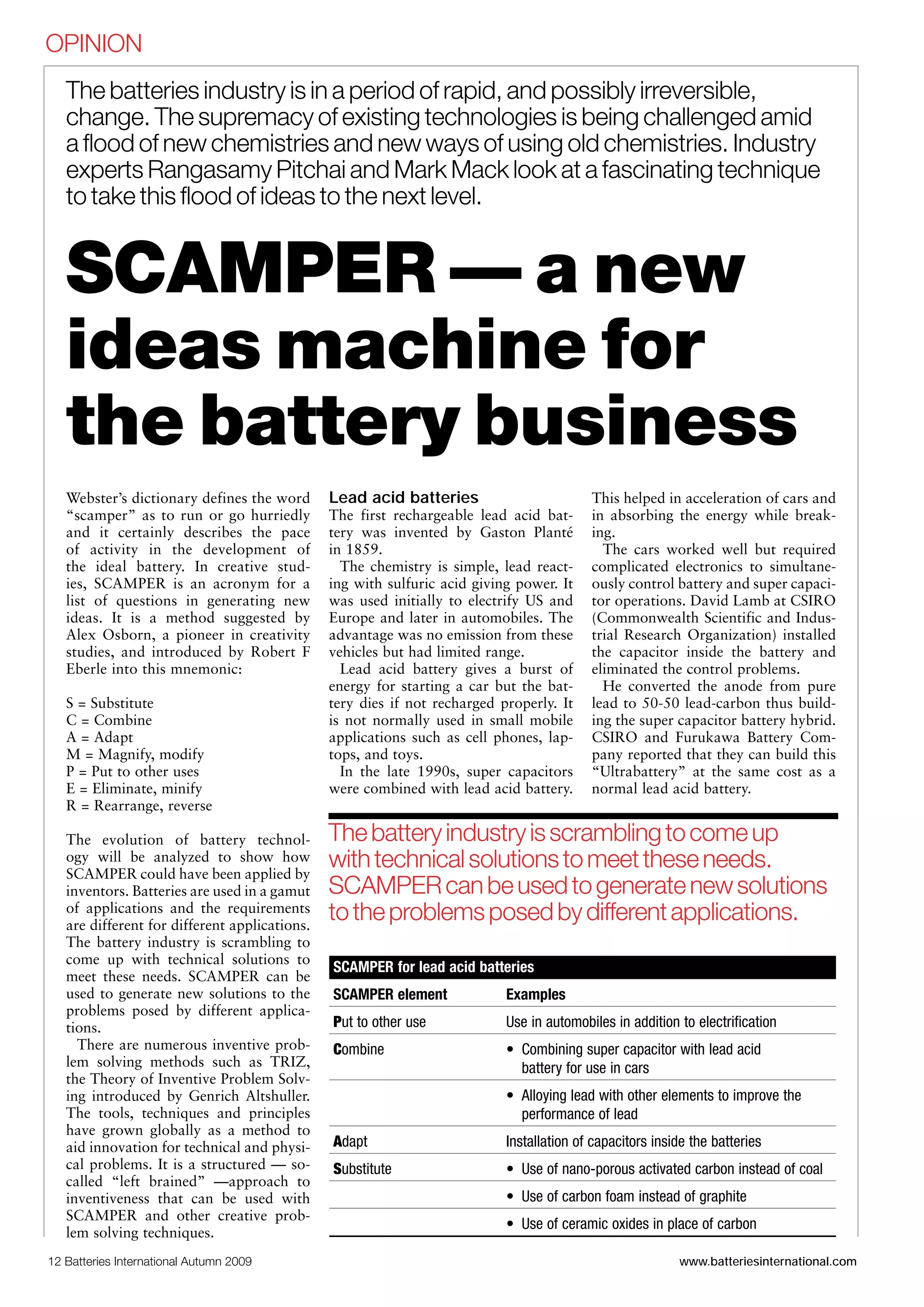 The document discusses battery technologies and how the SCAMPER method can be used to generate new ideas for improving batteries. It provides examples of how SCAMPER was applied to lead acid batteries, including combining them with supercapacitors. It also summarizes the history and development of nickel-cadmium, nickel-metal hydride, and lithium-ion batteries. SCAMPER can be a useful technique for battery innovators to develop new solutions tailored to different applications.