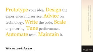 The document describes Imaginea, a company that provides product engineering services. It offers services such as prototyping ideas, designing user experiences, writing code, and scaling engineering. It works with global product companies across various technologies. Imaginea takes a design-first approach and uses agile methodology. It assembles project teams with the right skills and experience for each client's needs.