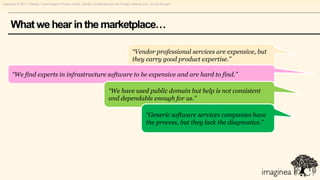 The document discusses Imaginea's product support services. It notes that Imaginea provides support for various software products using a multi-faceted approach involving product specialists, server internal experts, and middleware support specialists. The support process involves tracking cases through different levels of support and developing patches if needed. Imaginea aims to provide support according to specified service level agreements. Typical support phases involve application study, analysis and prototyping, with Imaginea and the customer working together on problem resolution. The document provides examples of support Imaginea has provided for companies including AppDynamics and Epocrates.