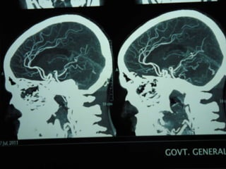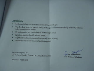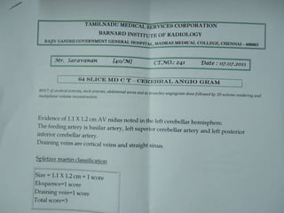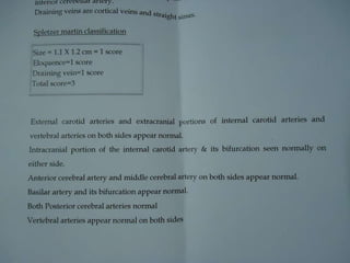 3. Cerebral angiography confirmed an arteriovenous malformation (AVM), which are congenital lesions caused by a failure of the embryonic vasculature to fully develop. The Spetzler-Martin grading system was then used to assess the AVM based on its size, location, and venous drainage patterns.