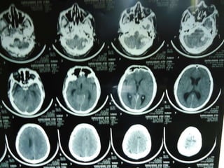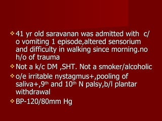 1. A 41-year-old man presented with vomiting, altered mental status, and difficulty walking. On examination, he showed signs of brainstem involvement including nystagmus and facial weakness.