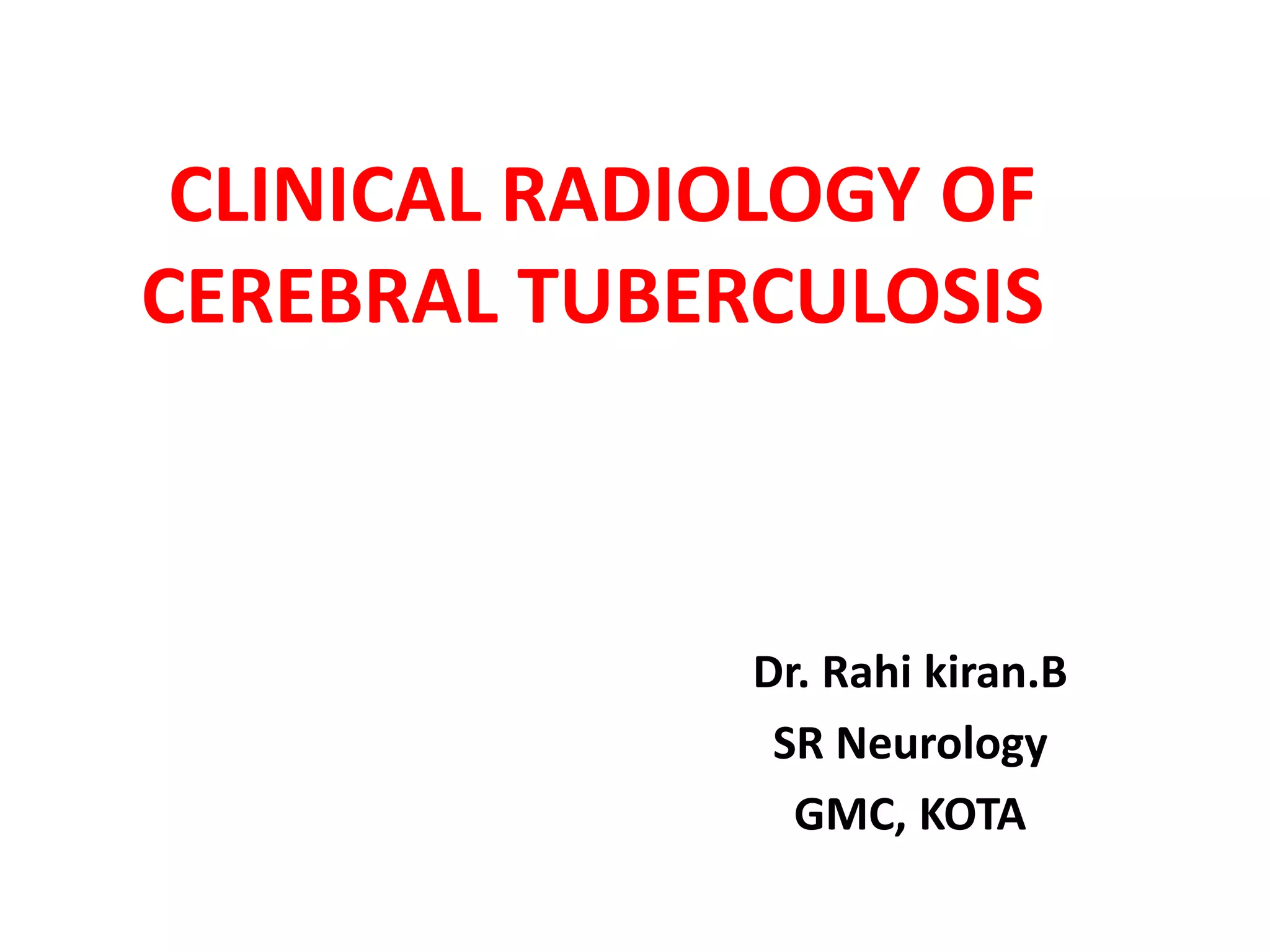 This document discusses various radiological manifestations of cerebral tuberculosis. It describes that approximately 10% of tuberculosis patients have central nervous system involvement. Imaging plays an important role in the diagnosis and evaluation of various intracranial manifestations of tuberculosis including tuberculous meningitis, tuberculoma, miliary tuberculosis, tuberculous encephalopathy and others. Characteristic radiological findings of each condition are outlined along with recommendations for appropriate imaging modalities. Spinal tuberculosis is also discussed with descriptions of typical radiographic and MRI findings.