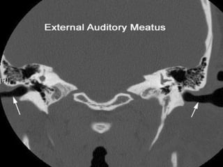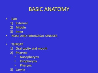 This document provides an overview of imaging modalities used in ENT and summarizes the anatomy and common diseases seen in the ear, nose, paranasal sinuses, and throat. It describes the basic anatomy of the external, middle, and inner ear. Common ENT diseases discussed include chronic suppurative otitis media, cholesteatoma, otosclerosis, deviated nasal septum, sinus polyps, and juvenile angiofibroma. Imaging findings for various diseases are presented along with anatomical images.