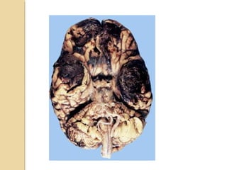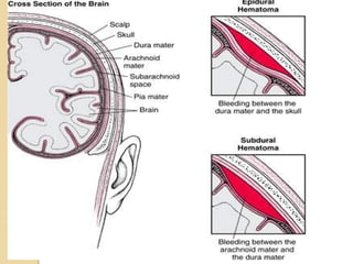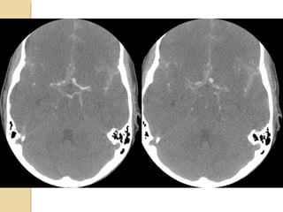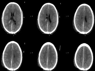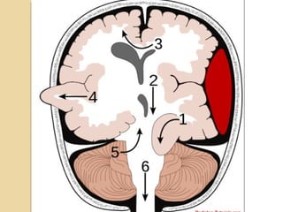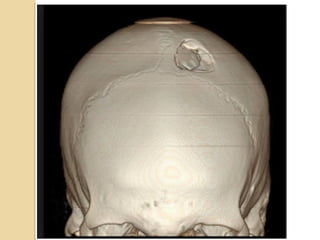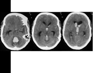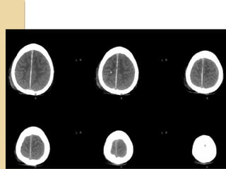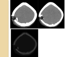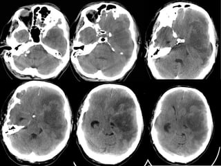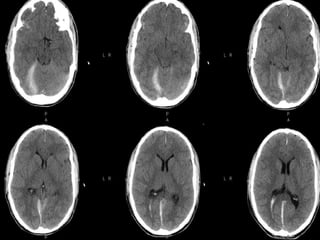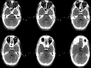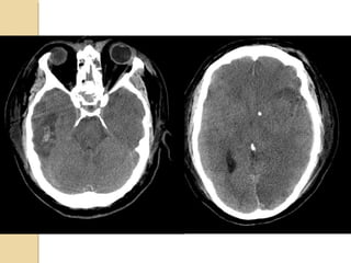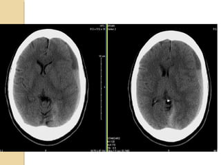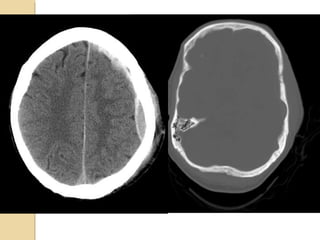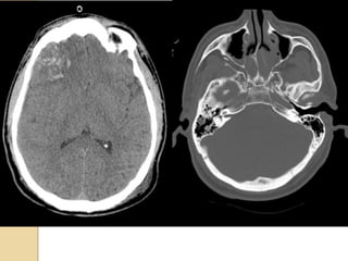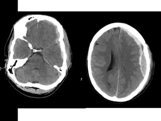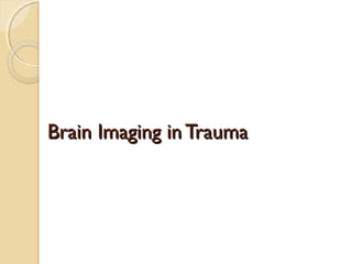 Brain imaging is important in trauma to identify injuries from primary impact and secondary complications. CT is best for acute trauma to detect fractures and hemorrhages while MRI is more sensitive for diffuse injuries. Common primary injuries seen include fractures, contusions, hematomas, shearing injuries and hemorrhages in various locations. Secondary complications can include swelling, infection and herniations putting pressure on vessels.