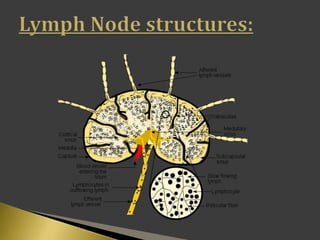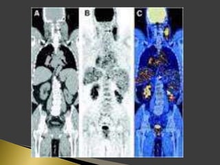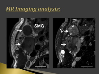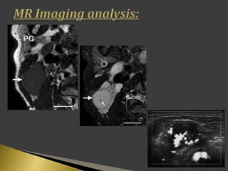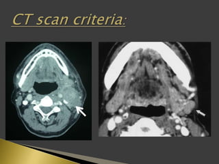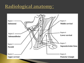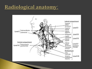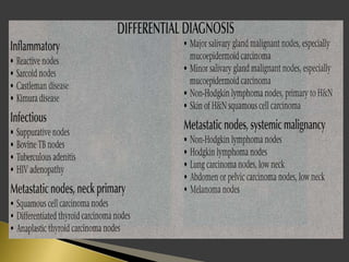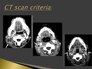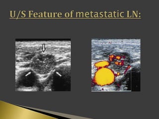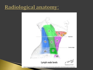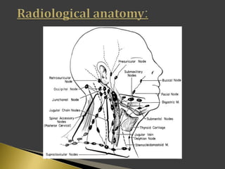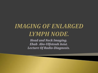This document discusses diagnostic imaging techniques for evaluating lymph nodes in patients with head and neck cancer. It describes the use of ultrasound, CT, MRI, diffusion-weighted MRI, and PET imaging to analyze lymph node characteristics like size, shape, margins, echogenicity, necrosis and vascularity which can help differentiate between metastatic, inflammatory and normal lymph nodes. Quantitative measurements like ADC from diffusion MRI and SUV from PET can also provide diagnostic information and predict cancer spread and treatment response.