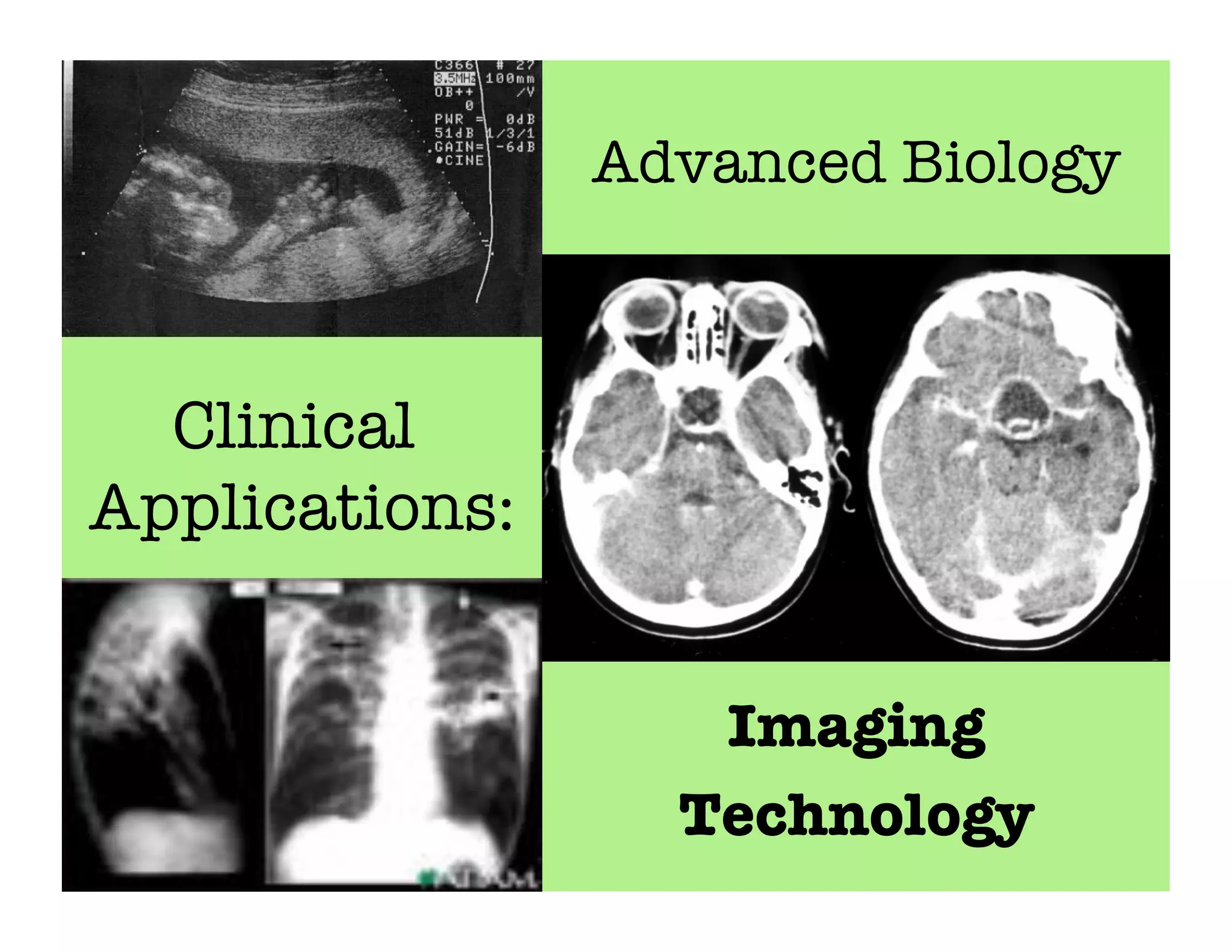 Imaging technologies allow physicians to view internal structures and diagnose diseases. X-rays were discovered in 1895 and can pass through objects. Computed tomography (CT) scans provide cross-sectional slices using X-rays while magnetic resonance imaging (MRI) uses radio waves and magnetic fields without X-rays. Ultrasound uses sound waves and nuclear imaging employs radioactive tracers to generate images. Endoscopy and colonoscopy examine the digestive tract using cameras on flexible tubes. These technologies revolutionized medicine by enabling non-invasive visualization of internal structures.
