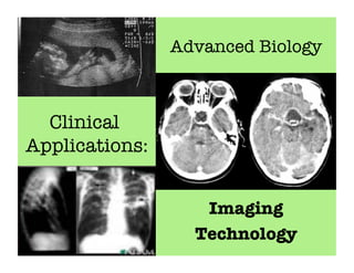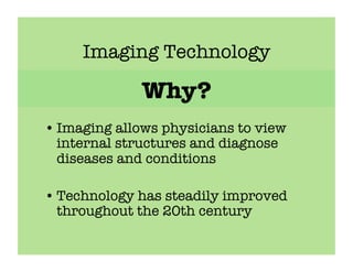 Imaging technologies allow physicians to view internal structures and diagnose diseases. X-rays were discovered in 1895 and can pass through objects. Computed tomography (CT) scans provide cross-sectional slices using X-rays while magnetic resonance imaging (MRI) uses radio waves and magnetic fields without X-rays. Ultrasound uses sound waves and nuclear imaging employs radioactive tracers to generate images. Endoscopy and colonoscopy examine the digestive tract using cameras on flexible tubes. These technologies revolutionized medicine by enabling non-invasive visualization of internal structures.
