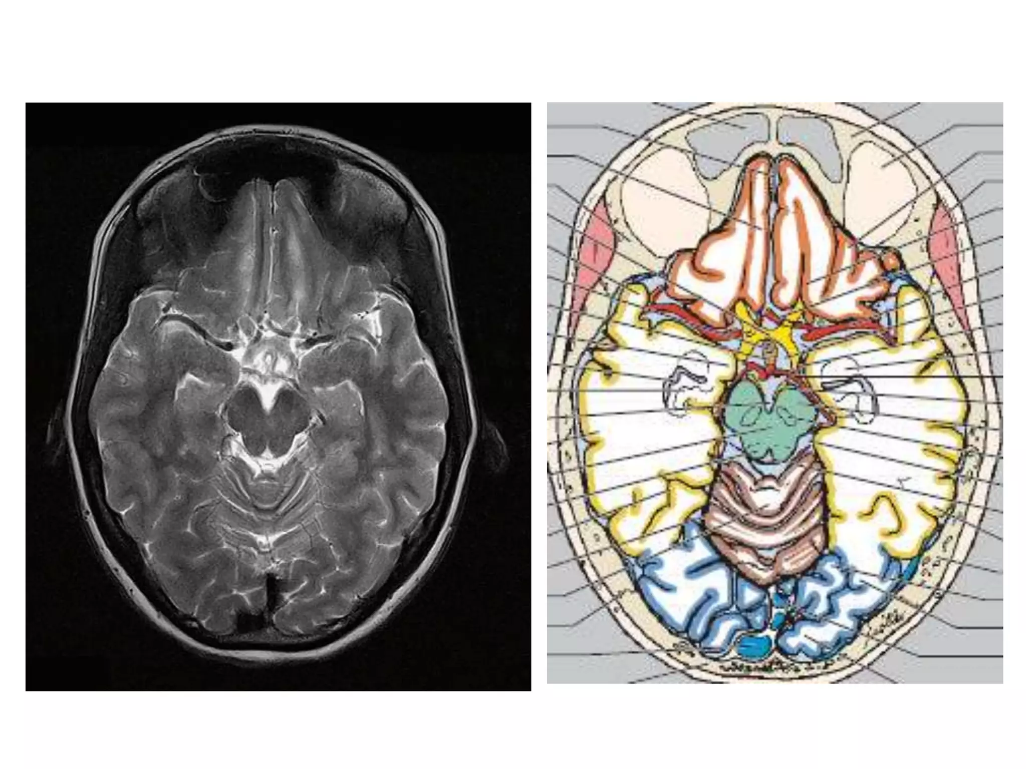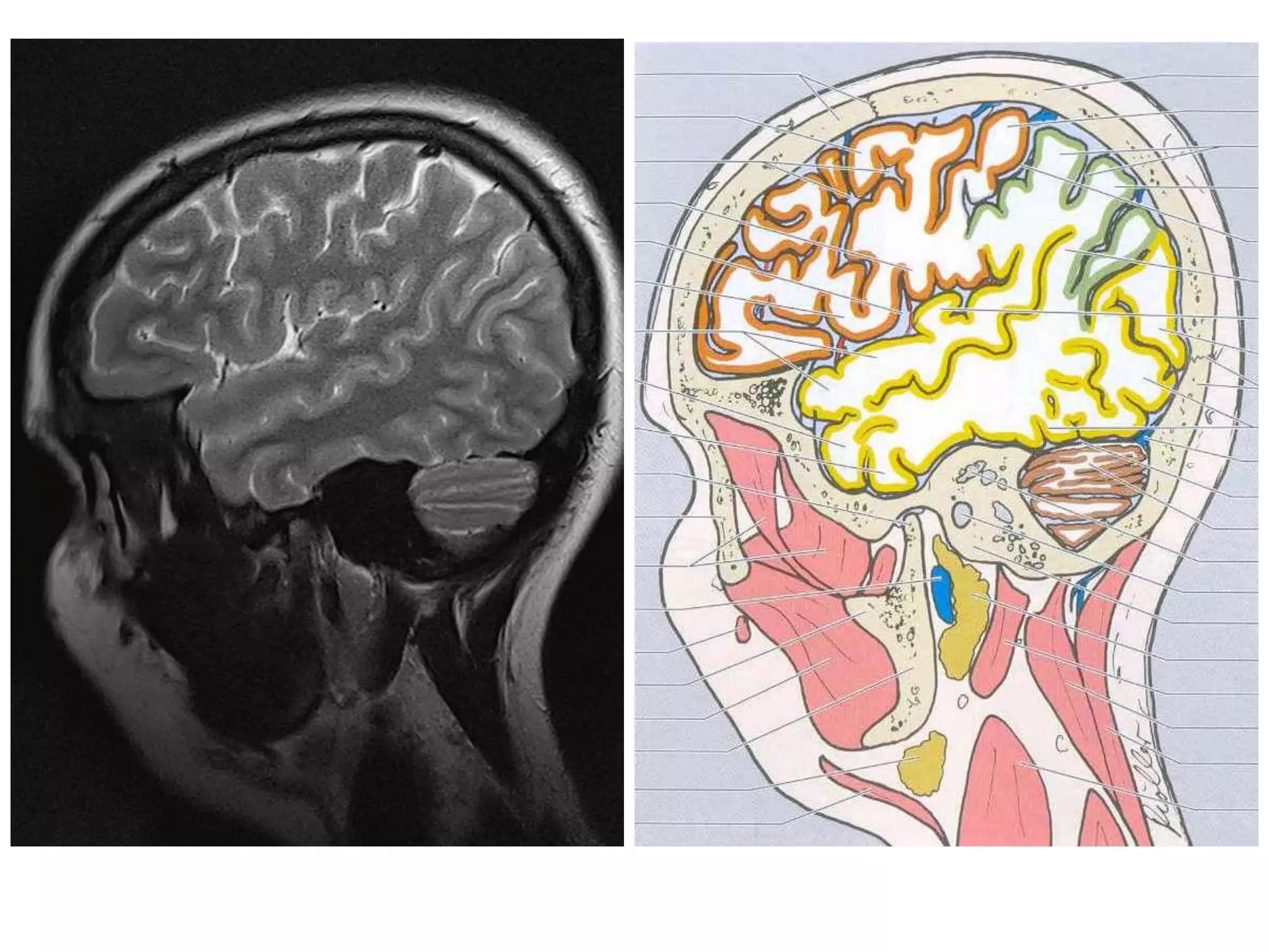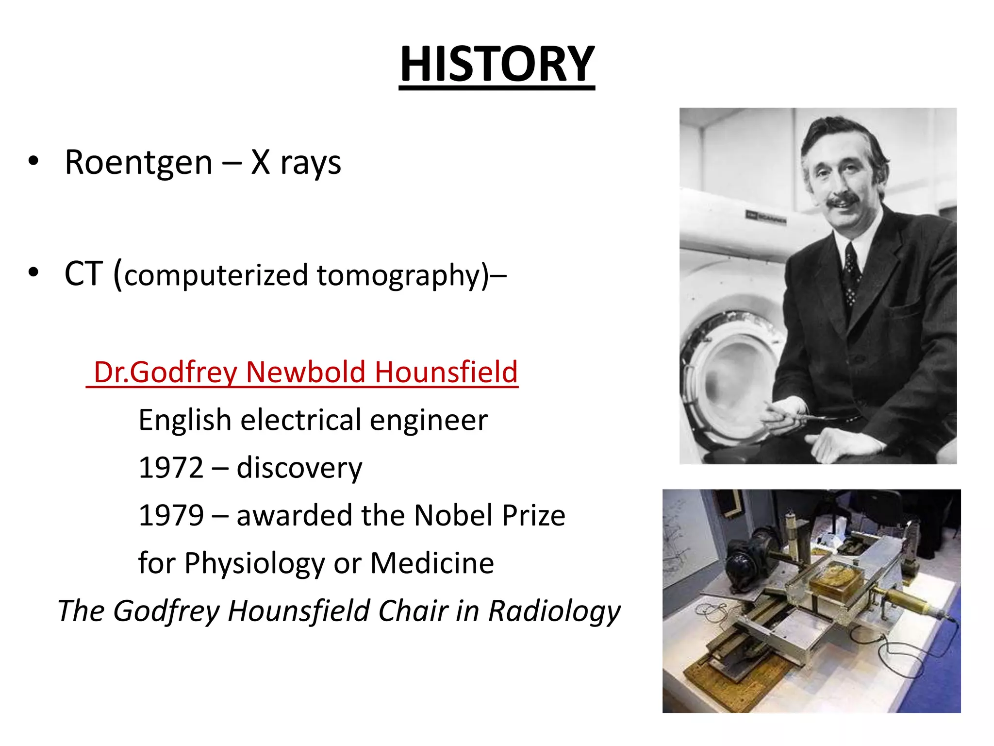 This document provides an overview of the history and anatomy of neuroimaging modalities. It discusses pioneers in X-rays, CT, MRI, and neuroradiology. It then describes the appearance of brain structures on different imaging sequences and outlines key anatomical regions including lobes, sulci, ventricles, cisterns, and CSF spaces. Hounsfield units and densities of brain tissues on CT are defined.