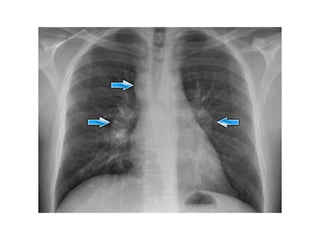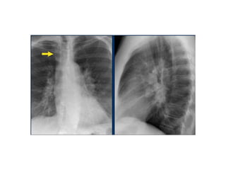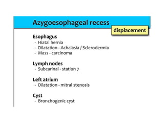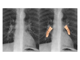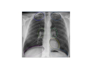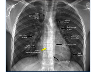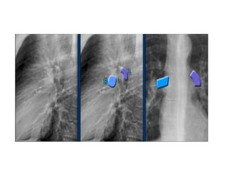 1. It describes the systematic approach used to evaluate chest x-rays, beginning with the heart and moving outward to the lungs, borders, and chest wall. Key anatomical structures and locations of potential missed findings are highlighted.