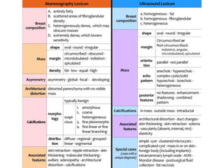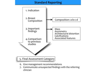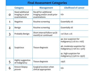 2. Guidelines for evaluating abdominal ultrasound images are outlined, including examination of organs and assessment for appendicitis. Breast imaging terminology and standardized reporting methods using BI-RADS are also summarized.