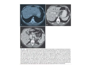 3. An overview of CT techniques is given, with details on the Couinaud classification of liver segments and methods for distinguishing them on cross-sectional images. Indications for procedures like barium studies and I