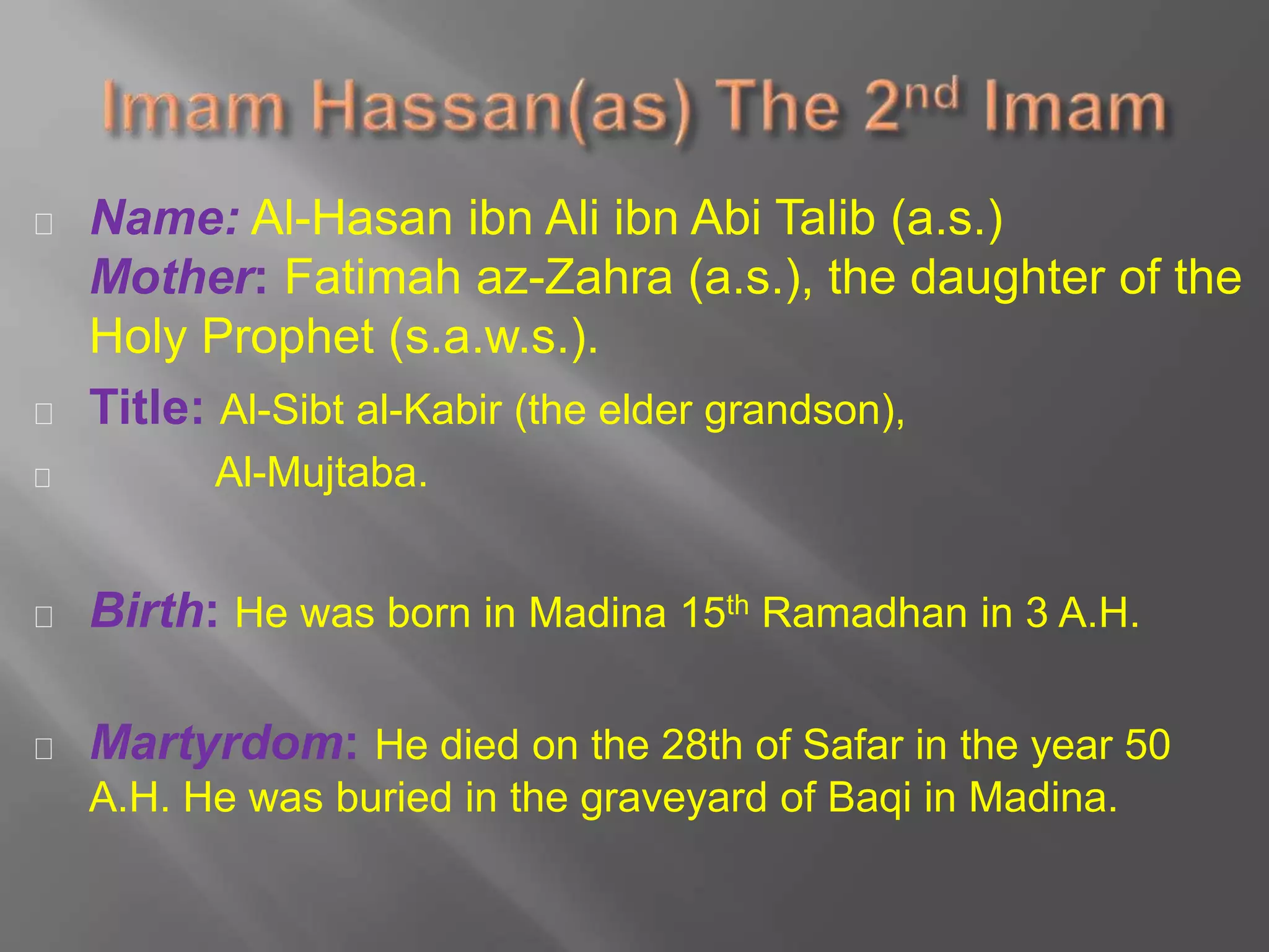 Al-Hasan ibn Ali ibn Abi Talib was born in Medina on the 15th of Ramadan in 3 A.H. and was the grandson of the Prophet Muhammad. He faced numerous challenges during his leadership after his father's martyrdom, including betrayal and division among his followers, ultimately leading to a peace treaty with Muawiya. Imam Hasan passed away at the age of 47, with his burial being a contentious issue due to animosity toward his family.