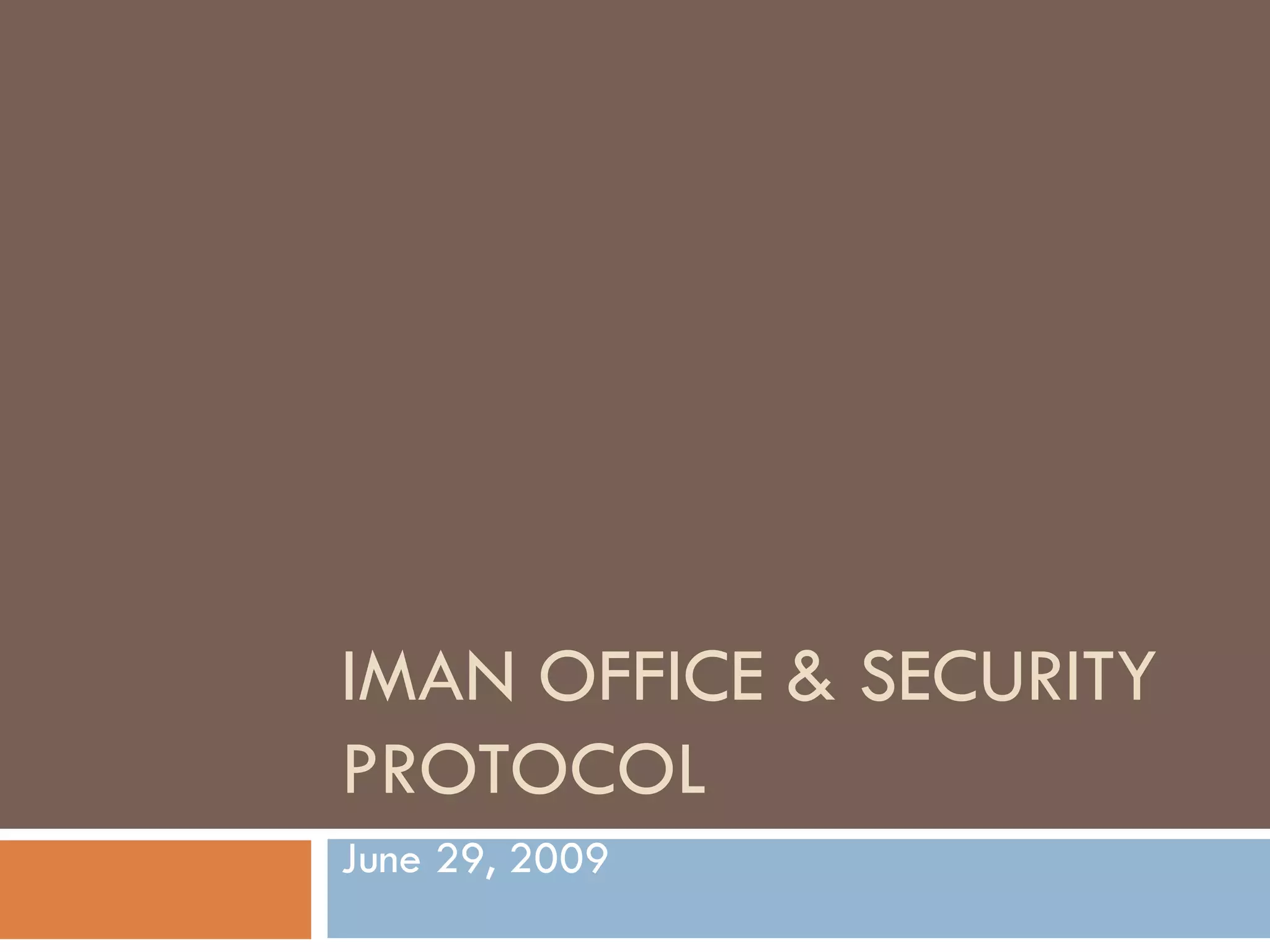 This document outlines office protocols and safety procedures for IMAN staff. It details administrative staff duties, general office rules around meetings and equipment use, and security measures like visitor sign-in and emergency response plans. Safety topics covered include prohibiting weapons, conducting evacuation drills, and designating storm shelters. The document provides guidance to ensure a secure and well-run office environment.