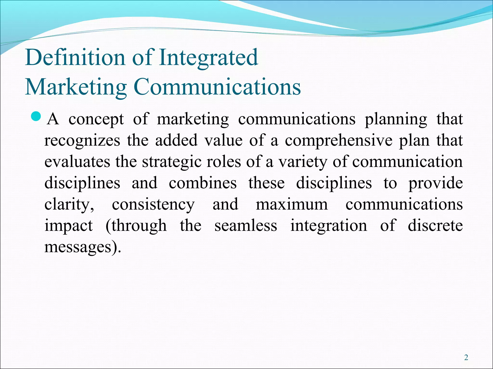 The document provides an overview of integrated marketing communications (IMC). It defines IMC as a planning concept that evaluates various communication disciplines and combines them to provide clarity, consistency and maximum impact. The document discusses two key ideas in IMC - one-voice marketing communications and integrated communications. It also outlines various IMC tools including advertising, direct marketing, interactive marketing, sales promotion, publicity/PR and personal selling. The document concludes by discussing promotional management and models that help conceptualize the buying process.