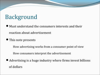 This document discusses consumer perspectives on advertising. It begins by explaining that advertising aims to understand consumer interests and reactions. It then discusses what advertising is, why companies advertise, and traditional models of how consumers process advertisements. It introduces the Elaboration Likelihood Model, which describes central and peripheral routes of persuasion. The document also covers subliminal advertising, measurement of advertising effectiveness using models like AIDA, and challenges in measuring effectiveness. It concludes that effective advertising requires understanding consumers.