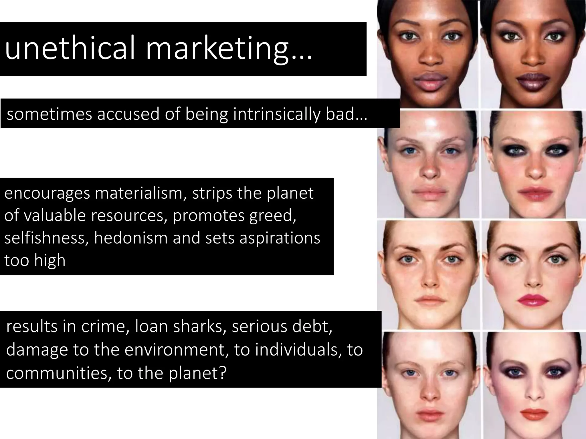 3) Marketers must find the line between ethical practices and effective competitive techniques. They must consider issues like CSR, deceptive practices, targeting children, and cultural influence.