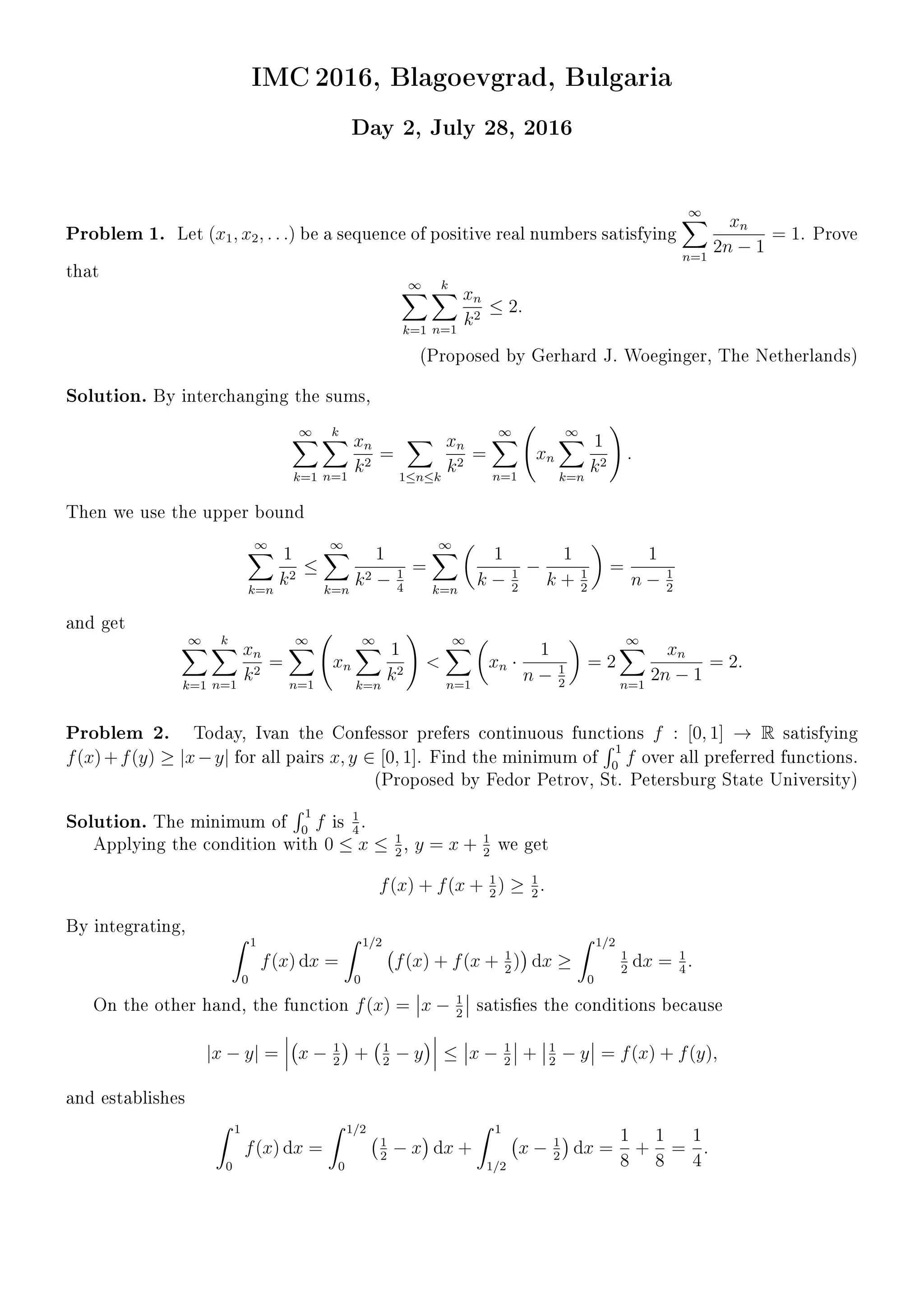 The document contains solutions to 4 problems posed at the IMC 2016 conference in Bulgaria.