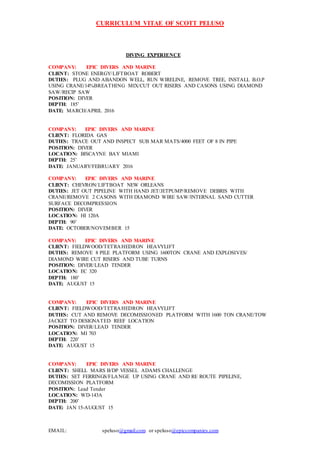 This document is a curriculum vitae for Scott Peluso that provides his contact information, qualifications, certifications, and experience as a commercial diver. It lists over 15 years of experience working on decommissioning and salvage projects in the Gulf of Mexico for companies like Epic Divers and Marine, with duties including cutting and removing platforms using diamond wire saws, cranes, and explosives at depths down to 485 feet. It details his qualifications and certifications in areas such as air diving, crane operations, welding, and first aid.