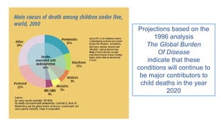 The Integrated Management of Childhood Illnesses (IMCI) is a strategy developed by WHO and UNICEF to address high child mortality rates. IMCI combines improved management of common childhood illnesses with nutrition, immunization, and other aspects of primary healthcare. It has three main components: improving health workers' case management skills through guidelines; strengthening health systems; and promoting better family/community practices. The IMCI case management process involves assessing children for danger signs, classifying illnesses, identifying treatments, providing counseling and follow up care.