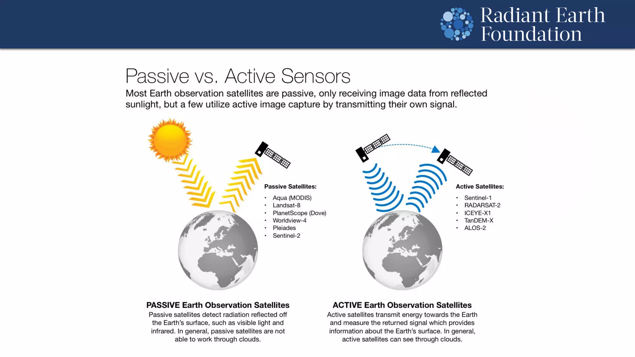 The document introduces remote sensing and machine learning, emphasizing how satellites capture data related to Earth's surface and atmosphere through electromagnetic radiation. It discusses the importance of vegetation indices and spectral signatures, along with the challenges in machine learning training data for land cover classification. The Radiant Earth Foundation aims to provide open access to geospatial data and enhance global collaboration in tackling critical challenges through its platform.