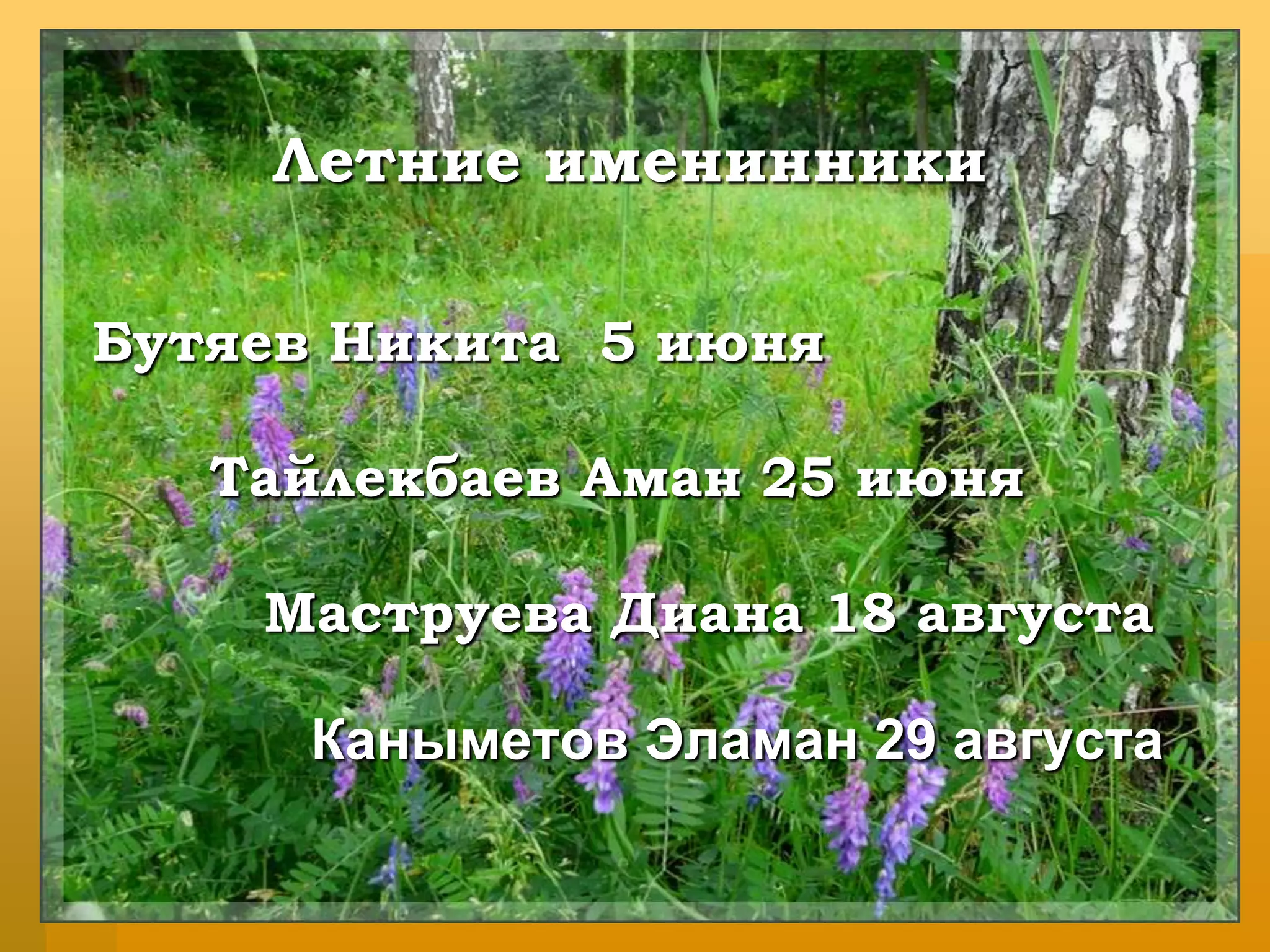 Документ содержит список именинников по сезонам: летние, осенние, зимние и весенние. В нем указаны имена и даты рождения для каждой группы. Примеры именинников включают Никита Бутяев (5 июня) и Лиза Стельмахович (15 февраля).