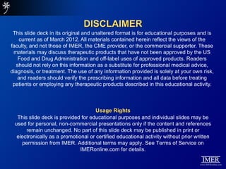 This slide deck, intended for educational purposes, provides information about chronic myeloid leukemia (CML) therapies, diagnostic approaches, and management strategies, reflecting views of various medical faculty. Key learning objectives include optimal therapy selection based on patient characteristics, understanding laboratory tests for diagnosis and monitoring, and addressing relapses and second-line treatment options. Disclaimers emphasize that the content does not substitute professional medical advice and may discuss unapproved drug uses.