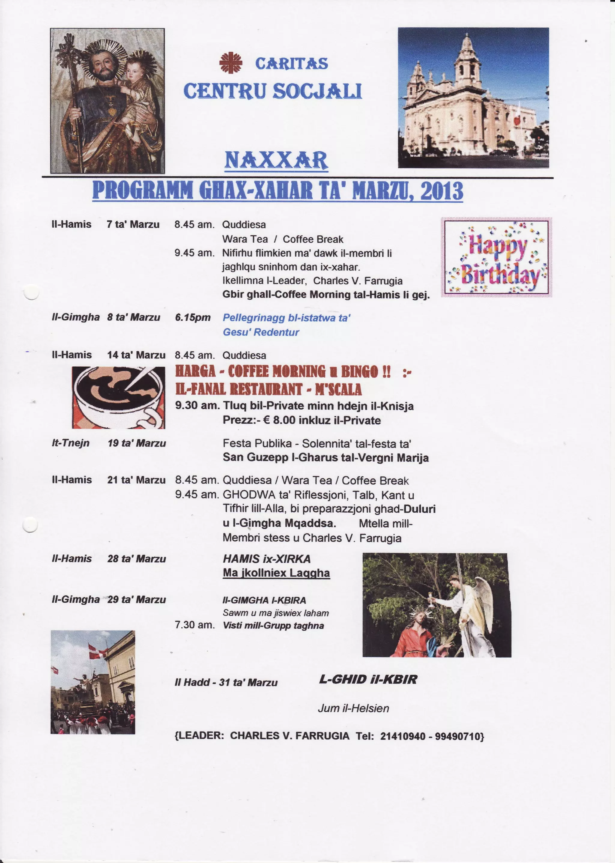 CSNTRUSOGIATI ll-Hamis 7 ta'Marzu 8.45am. Quddiesa WaraTea / CoffeeBreak ;"r1" -ft;f ll J'[Ne1141q11 '""' 9.45am. Nifirhuflimkienma'dawkil-membri li jaghlqu .P,- lif *" sninhom ix-xahar. dan lkellimna l-Leader,Charles Fanugia V. Gbir ghall-CoffeeMorning tal*lamis ti gej. Il-Gimgha t h'Matzu 6.15pm Pellegrinagg bl-istatwata' Gesu'Redentur ll*lamis 14 ta' Marzu 8.45am. Quddiesa f,ll0r, $ttH mrmffi r Btilcl!! |t ffi It-Tnejn 79 ta'fganu Il4il{tlrx$Nmm, t'siltr 9.30 am. Tluq bil-Privateminn hdejn il-Knisja Prezz:-€ 8.00 inkluz il-Private FestaPublika Solennita'tal-festa - ta' San Guzepp l-Gharustal-Vergni Marija ff-Hamis 2{ ta'Marzu 8.45 am. Quddiesa/ Wara Tea lCoffee Break 9.45 am. GHODWAta'Riflessjoni, Talb, Kant u Tifhirlill-Alla, preparazzjoni bi ghad-Duluri u l-G.imgha Mqaddsa. Mtellamill- Membristessu CharlesV. Fam.rgia IhHamis 28 h'fiarzu HAMTS ix-XIRKA Ma ikollniex Laqoha Il-Gimgha -29 h'tatzu ,I.G'NGHAhKBIRA Sawmu ma jiswiexlaham 7.30 am. Vkti miu-Gruptaghna ll Hadd-31h'Marzu L.GHTD 1'.KB'R Jumil-Helsien (LEADER: CHARLES FARRUGIATel: 2t4{0940 - 9s490710} V.