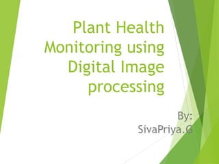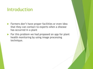 This document describes a proposed app for plant health monitoring using digital image processing. The app would allow farmers to capture images of plant leaves using a camera phone and send them to an image processing server. The server would preprocess the images to remove noise, segment the leaves from the background, extract features like color and texture, and classify the leaves as healthy or diseased using a support vector machine model. This would help farmers identify plant diseases without needing to contact experts, reducing time and costs. However, the method may not be applicable to all types of plants.