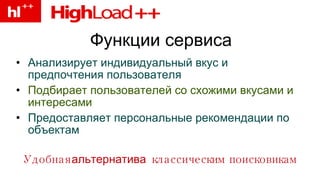 Документ описывает архитектуру и функциональные компоненты рекомендательного движка сайта imhonet.ru, включая анализ пользовательских предпочтений и подбор аналогичных пользователей. Основное внимание уделяется методам хранения и обработки оценок с использованием различных структур данных, таких как разреженные матрицы и хэш-таблицы, а также обеспечению многопоточности. В результате представлены результаты производительности системы, включая количество расчетов рекомендаций и операций чтения в секунду.