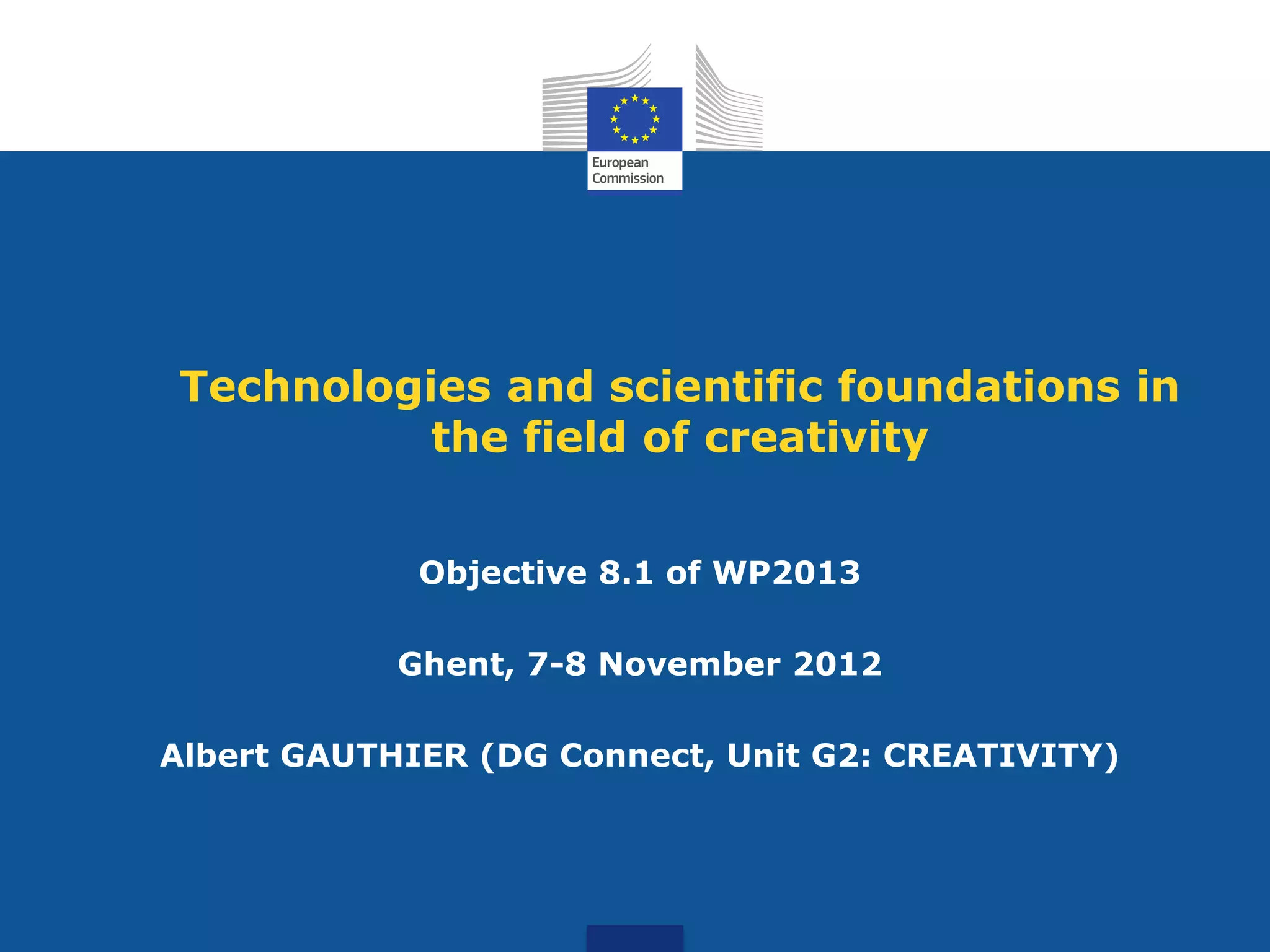 This document outlines the objectives, target outcomes, and call details for Objective 8.1 of the European Union's FP7-ICT-2013-10 work program on creativity and cultural industries. The objective focuses on four target outcomes: (1) creative experience tools, (2) intelligent computational environments, (3) progress towards a formal understanding of creativity through autonomous systems, and (4) roadmaps for future research. Grants totaling €32 million will fund projects addressing outcomes (1)-(3), with a minimum of 40% for integrated projects and 30% for smaller projects. A €1 million grant will fund a coordination/support action to develop roadmaps under outcome (4). The deadline for project proposals is January