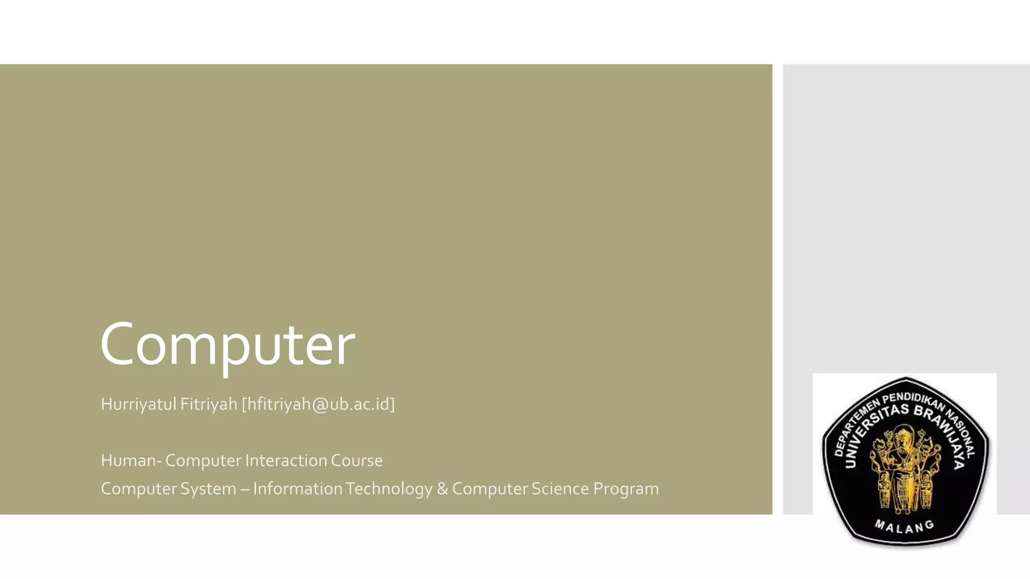 Dokumen tersebut merangkum tentang komputer dan interaksi manusia-komputer. Menguraikan komponen utama komputer seperti input device, output display, memory, dan processor. Juga menjelaskan berbagai jenis input device seperti keyboard, mouse, microphone, dan display output seperti monitor, printer.