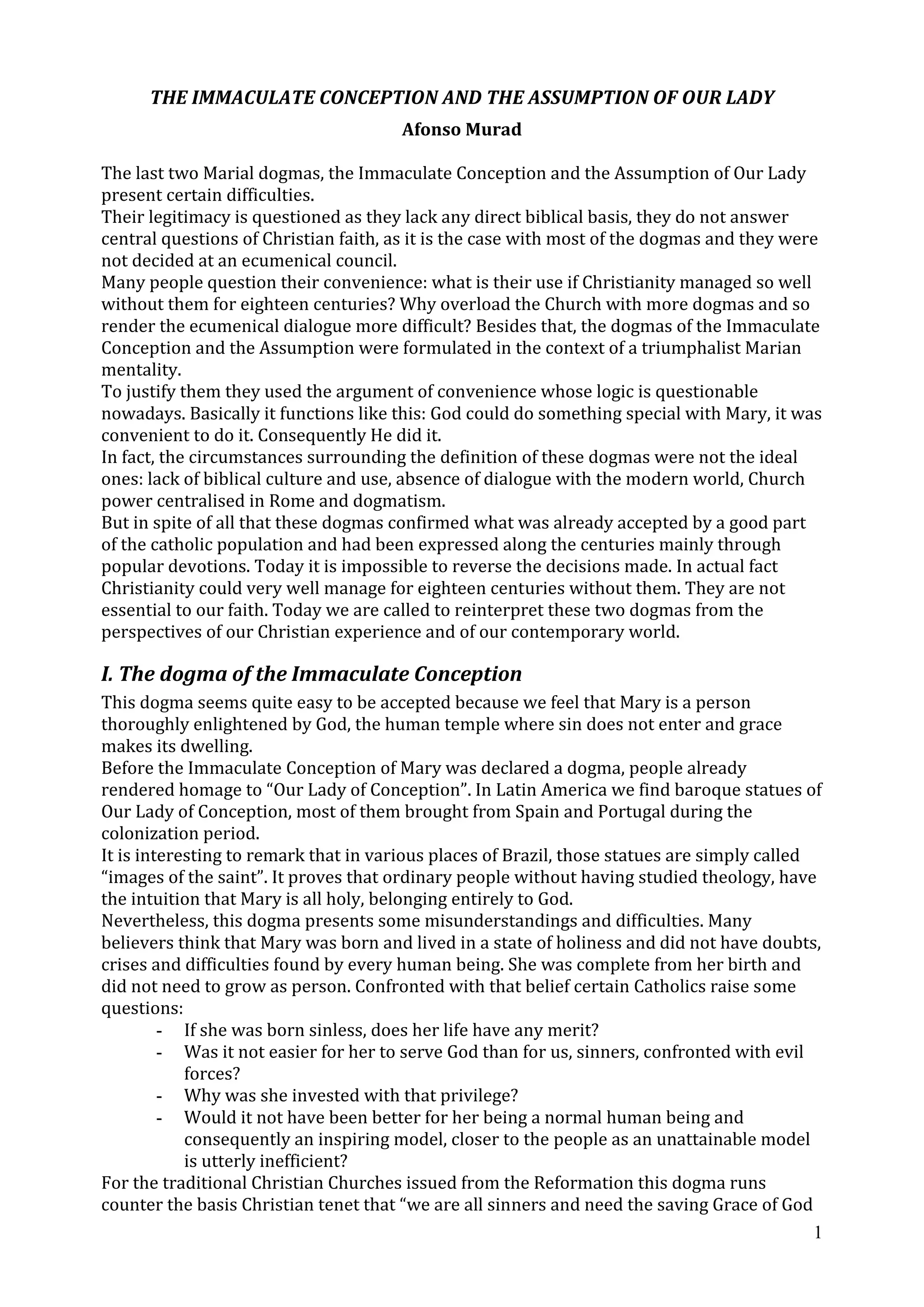 1. The dogmas of the Immaculate Conception and the Assumption of Mary are controversial as they lack biblical basis and were defined by popes rather than ecumenical councils. However, they confirm long-standing Catholic beliefs.
