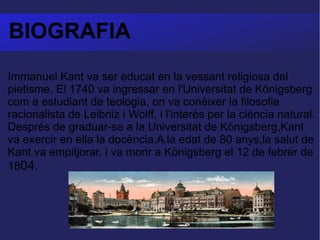 BIOGRAFIA Immanuel Kantva ser educat en la vessant religiosa del pietisme. El 1740 va ingressar en l'Universitat de Königsberg com a estudiant de teologia, on va conèixer la filosofia racionalista de Leibniz i Wolff, i l'interès per la ciència natural. Després de graduar-se a la Universitat de Königsberg,Kant va exercir en ella la docència.A la edat de 80 anys,la salut de Kant va empitjorar, i va morir a Königsberg el 12 de febrer de 18 04.