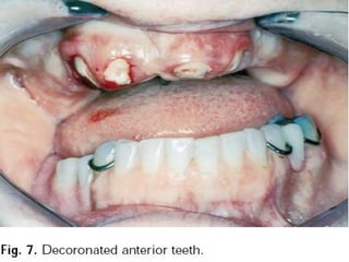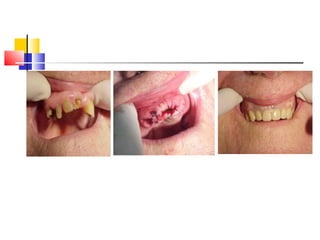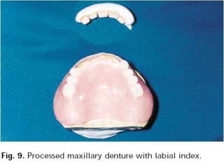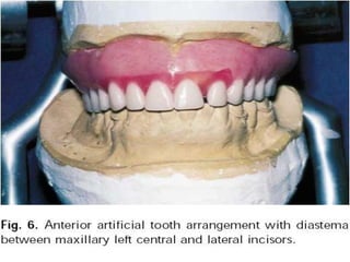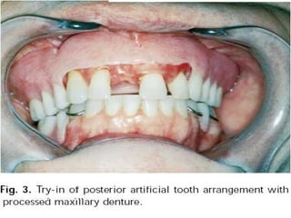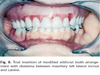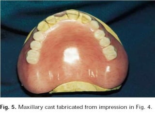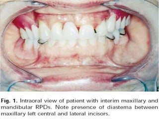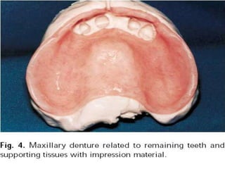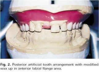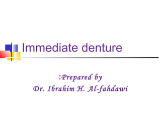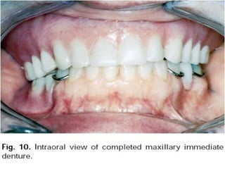 An immediate denture is a denture constructed before natural teeth are extracted, allowing it to be placed immediately after the extractions. It helps maintain appearance and functions like chewing and speech after tooth loss. While it provides advantages like minimized pain and bleeding, it also has limitations like inability to do try-ins and increased maintenance needs. The denture can be made with or without flanges, with flanged dentures providing better stability, strength and hemorrhage control but open-faced dentures may be preferable in cases with deep undercuts. Careful patient preparation and techniques like custom trays and records are needed to fabricate an immediate denture.