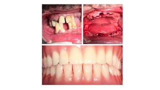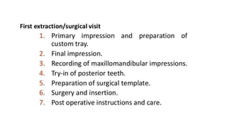Immediate dentures are prostheses fabricated and inserted immediately following tooth extraction. There are two main types: conventional (classic) immediate dentures which serve as long-term prostheses, and interim (transitional) immediate dentures which will be replaced later after healing. The clinical and laboratory procedure involves making impressions, modifying the stone cast for improved fit, optionally using a surgical template, and inserting the denture immediately after extractions with follow-up relines and adjustments as needed. Immediate dentures can help maintain appearance, function, and quality of life but require more appointments and technical skill compared to delayed dentures.