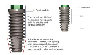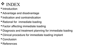The document discusses the immediate loading protocol in dental implants, highlighting the evolution of surgical techniques to enhance treatment efficiency and patient needs. It outlines indications, contraindications, and the factors affecting immediate loading, emphasizing the importance of primary stability and bone quality. Also covered are the advantages and disadvantages of immediate loading, along with the rationale for its application in implant dentistry.
