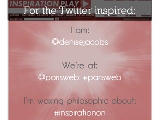 Denise R. Jacobs discusses the concept of inspiration and its origins, defining it as the act of filling with life or influence. She emphasizes the role of external influences, such as muses, and the importance of managing internal blocks like fear and self-doubt to foster creativity. Jacobs suggests practical methods for inviting inspiration, encouraging collaboration, and emphasizing that ideas are seeking individuals to manifest them.