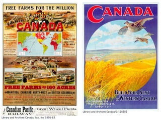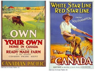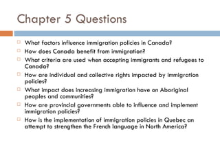 The document discusses factors that influence Canadian immigration policy and how immigration affects Canada. It examines push factors that cause people to emigrate from their home countries, such as economic, political, health, security, and rights issues. Pull factors that attract immigrants to Canada are also considered, such as quality of life, economic opportunities, and offering refuge to refugees. The criteria used to accept immigrants and refugees prioritizes economic immigrants, family reunification, and humanitarian needs. Provincial governments can influence immigration policies and Quebec implements policies to strengthen the French language.
