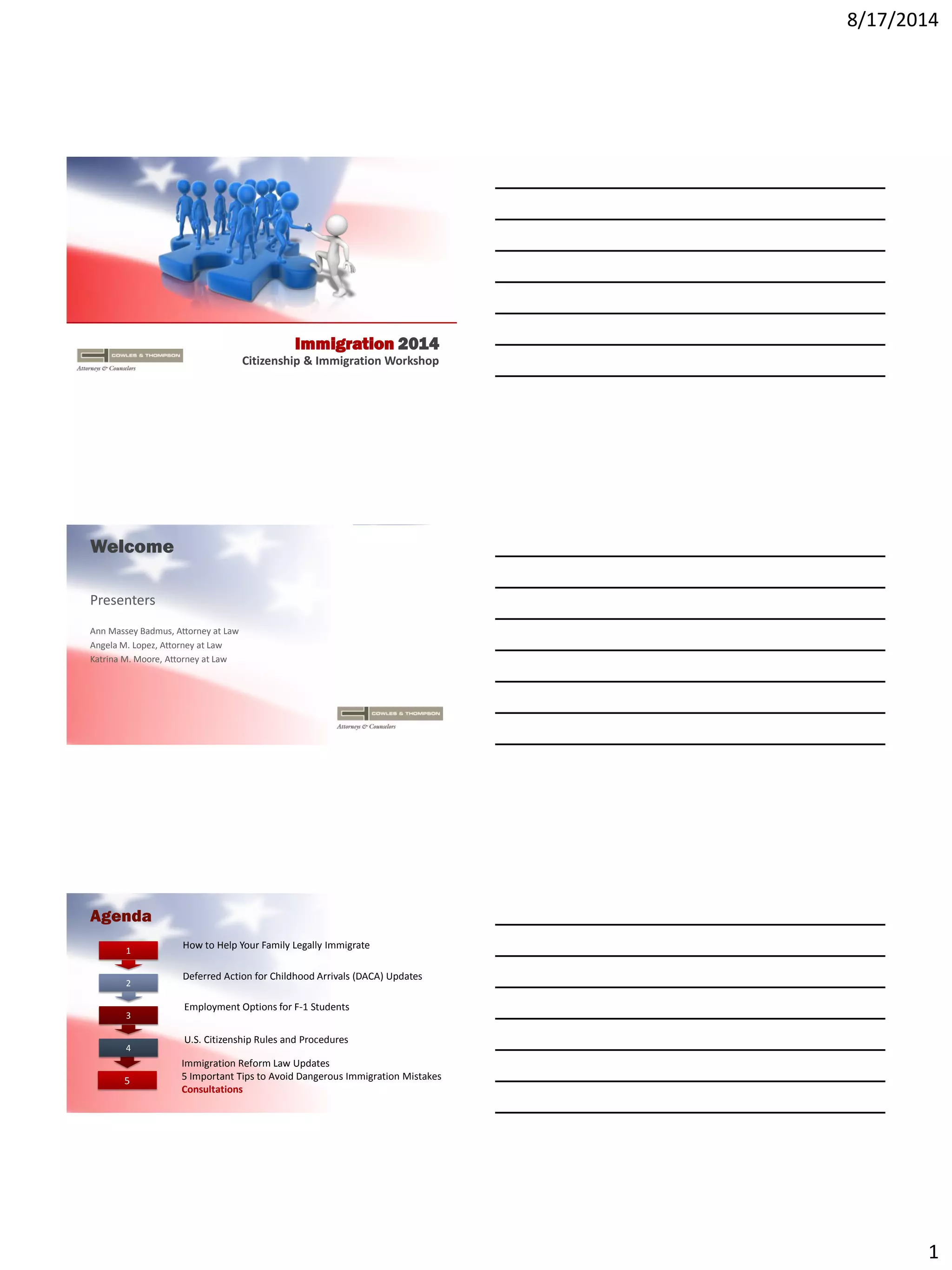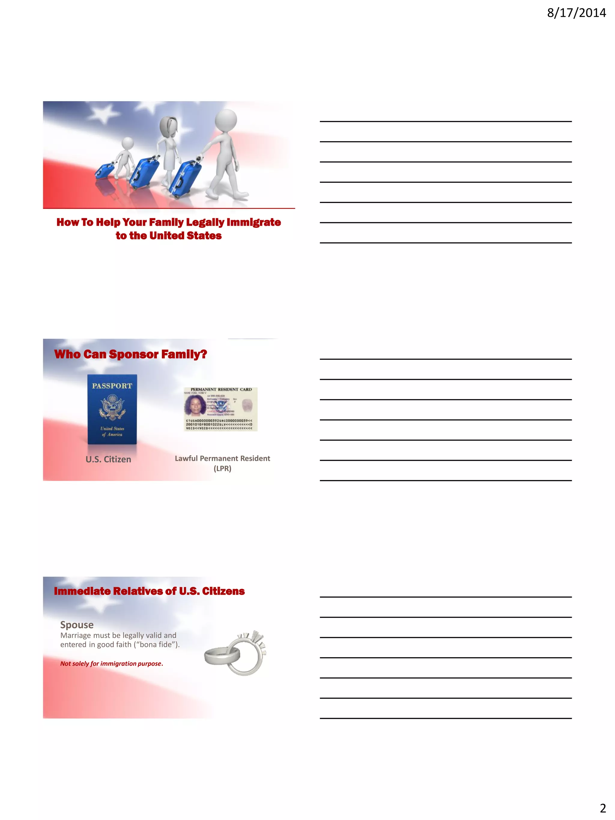 The document provides a comprehensive overview of U.S. immigration processes, focusing on family immigration, work options for F-1 students, and pathways to citizenship. It discusses the roles of U.S. citizens and lawful permanent residents in sponsoring family members, outlines various visa categories and waiting periods, and details the naturalization process along with potential pitfalls. It also covers recent updates on Deferred Action for Childhood Arrivals (DACA) and immigration reform predictions.