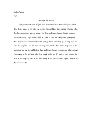 Our government needs to increase border security funding to prevent illegal immigration while also making the legal immigration process easier and more affordable. While illegal immigration does not directly affect the author, reforming the system could help people enter the country legally through improved background checks and a simplified process, allowing immigrants to contribute to American society.