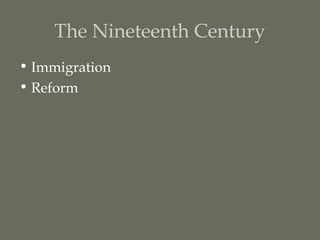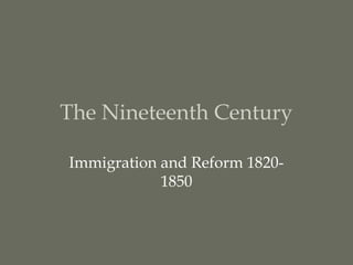 This document discusses immigration and reform movements in the United States between 1820-1850. It saw a large influx of immigrants from Ireland, Germany, and other parts of Europe. The Irish made up the largest group and faced difficult conditions during travel and upon arrival. They established tight-knit communities but faced anti-Catholic and anti-immigrant sentiment. Meanwhile, reform movements grew including transcendentalism, temperance, education, women's rights, and abolitionism, reflecting social changes in this period.