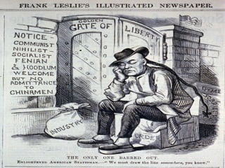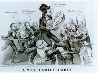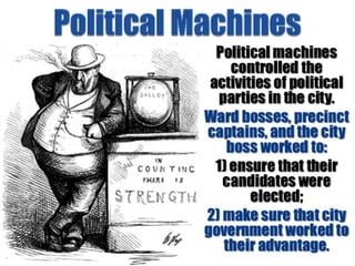 Political machines like Tammany Hall provided social services and jobs to immigrants in cities in exchange for votes, leading to corruption. Boss Tweed and the "Tweed Ring" controlled Tammany Hall and embezzled millions, leading to reforms like the Pendleton Civil Service Act to establish merit-based government hiring. Most late 1800s/early 1900s presidents pushed reforms, with the exceptions of Grant and Taft who maintained the status quo.