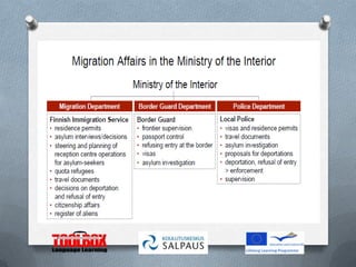 Immigration to Finland has declined since 2008, though foreigners still make up 3% of the population. The largest immigrant groups come from Russia, Estonia, and Somalia. Finland's immigration policy focuses on integration, equal treatment, and maintaining immigrants' own languages and cultures. Adult education targets include strengthening language teaching, validating prior learning, and increasing training for teachers of immigrants.