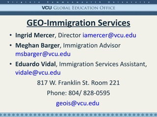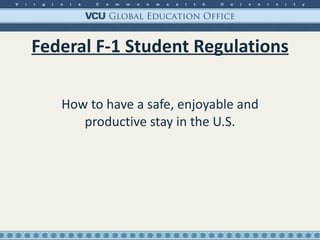 This document provides information and guidance for international F-1 students attending Virginia Commonwealth University (VCU). It outlines important policies regarding maintaining legal immigration status, including maintaining full-time enrollment, checking VCU email regularly, keeping immigration documents like I-20 and passport up-to-date, reporting changes to VCU promptly, and following employment and travel regulations. It emphasizes the importance of understanding and complying with immigration rules to have a safe and productive academic experience.